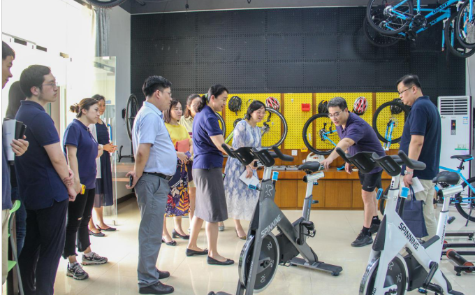 当日,殷行社区党工委的各位老师实地参观了新近建成的休闲体育实训中心,该中心实地真人展示了虚拟仿真、智慧互联在高尔夫球、自行车、大众健身的教学和实训方面的具体运用和使用场景。