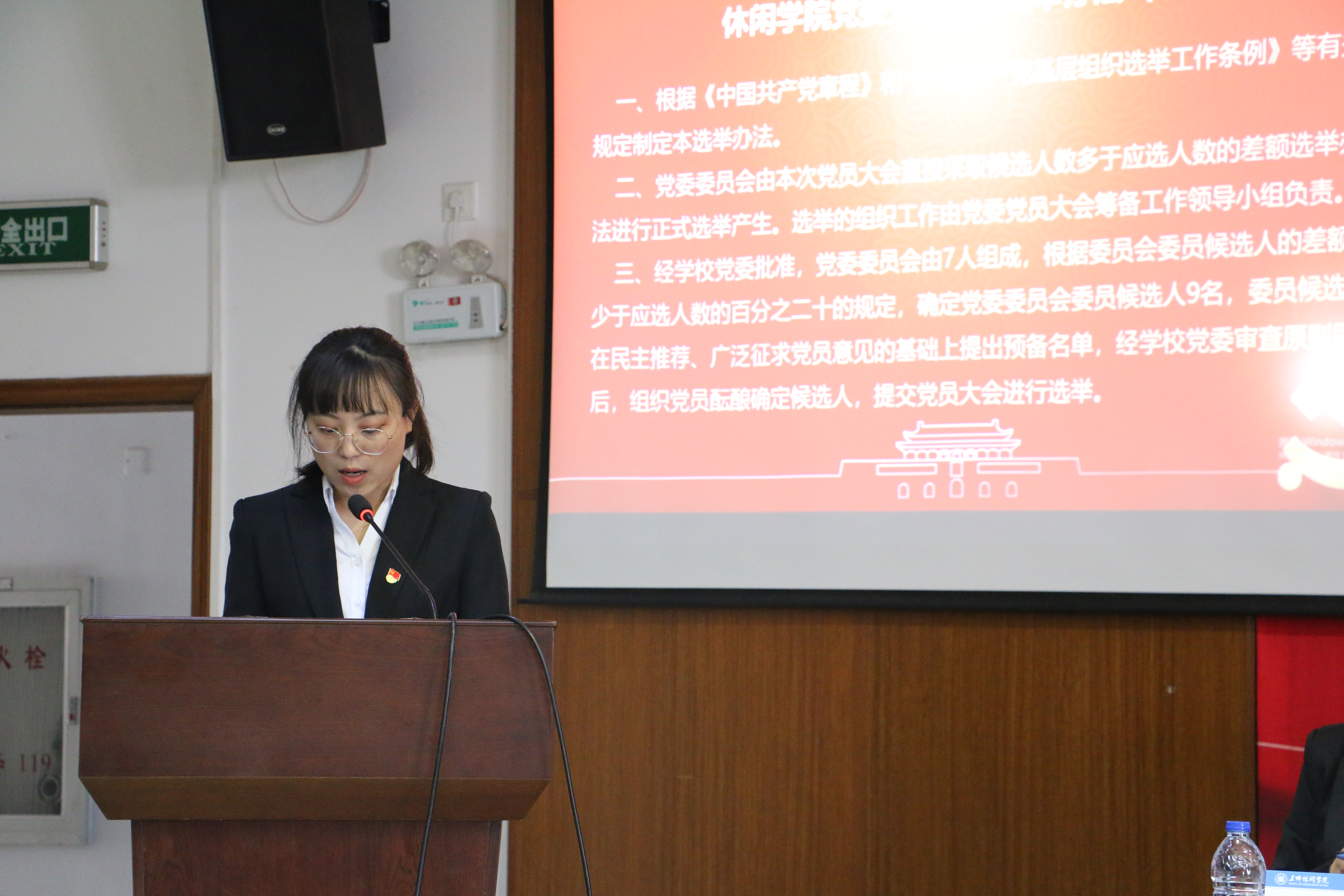 最后,根据《中国共产党章程》、《中国共产党基层组织选举工作条例》等有关规定,霍圣录同志代表休闲学院党委党员大会筹备工作领导小组宣布休闲学院党委委员会组成人员名额和候选人名单,大会通过无记名投票差额选举的方式,从九名候选人中差额选出了七名党委委员会委员,选举结果(按姓氏笔划为序):王红英、孙一可、李文阁、郑家鲲、顾郑军、韩耀刚、和霍圣录七位同志当选为学院新一届党委委员。休闲学院党委委员选举大会获得圆满成功。