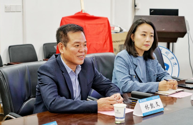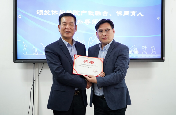 顾郑军副书记为林凯文会长颁发休闲学院产教融合、协调育人校外导师聘书;期待林凯文会长能在未来合作发展及研究性学习活动中多了解学校师生,并提供宝贵意见和建议。