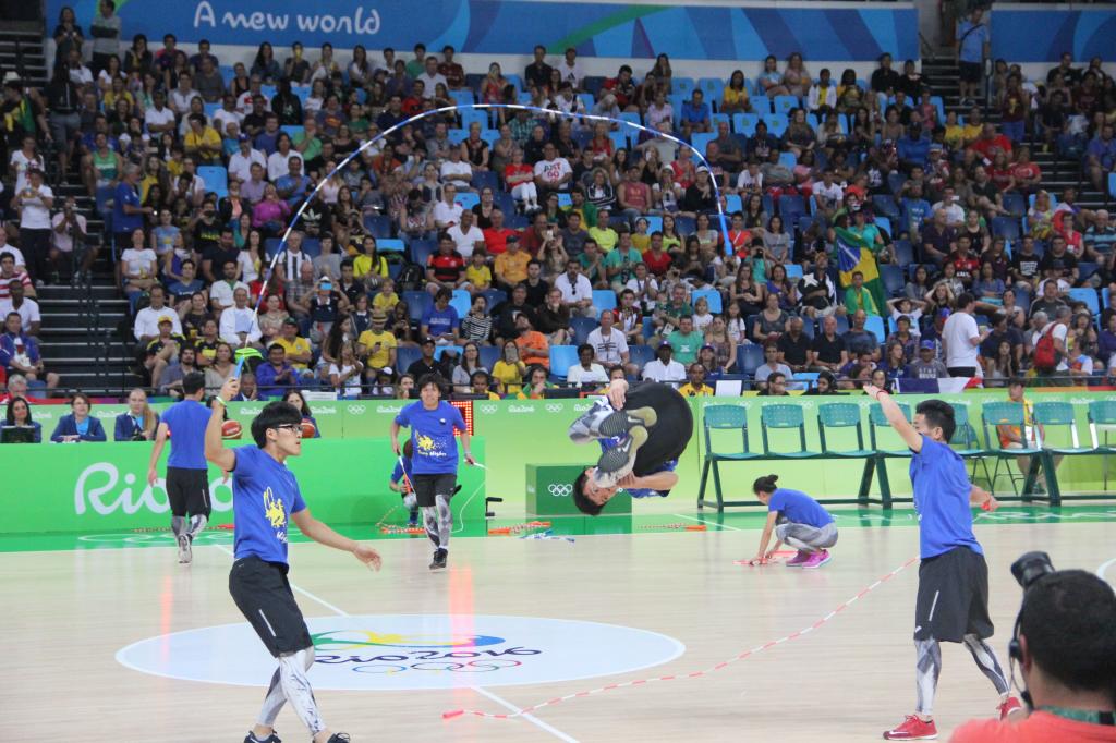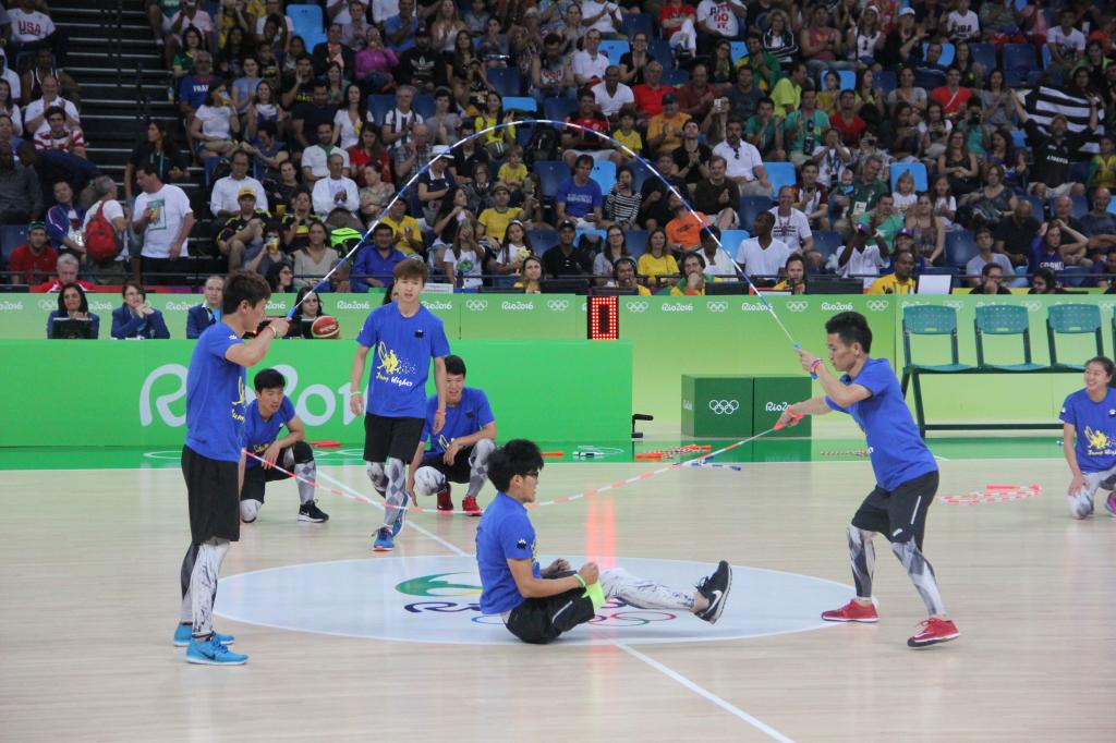 巴西时间8月21日是举世瞩目的第31届奥林匹克运动会闭幕的日子,下午男子篮球金牌争夺战颇受关注,里约奥运室内最大馆16000人ANEAN CARIOCA 1内座无虚席,比赛中场时间16:15-16:20分由上海体育学院携手上海跃动跳绳俱乐部及两名外籍跳绳世界冠军共同组成的国际奥运跳绳表演队惊艳亮相,充满节奏与力量的花式动作、快速整齐的队形变化、多元融合的表演风格,激情绽放,吸引眼球,现场16000余名观众掌声不断,享受中国上海体育学院花样跳绳带来的青春跃动和创新世界的快乐。