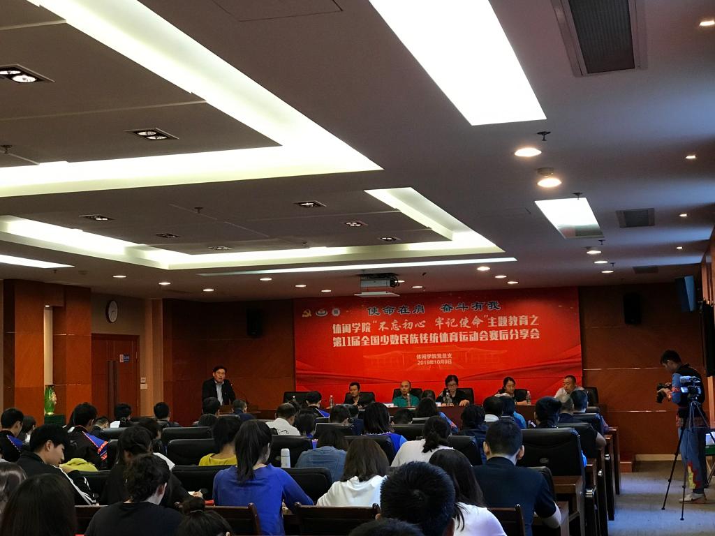 10月9日下午,休闲学院在图文信息楼第二会议室举行“不忘初心、牢记使命”主题教育之“使命在肩、奋斗有我”第十一届全国少数民族传统体育运动会赛后分享会。党委副书记、纪委书记詹萌,组织部、统战部部长王继红、训竞处处长邵斌、休闲学院领导班子及全体教职工、学生党员参加了本次活动。分享会由休闲学院副书记、副院长顾郑军主持。
