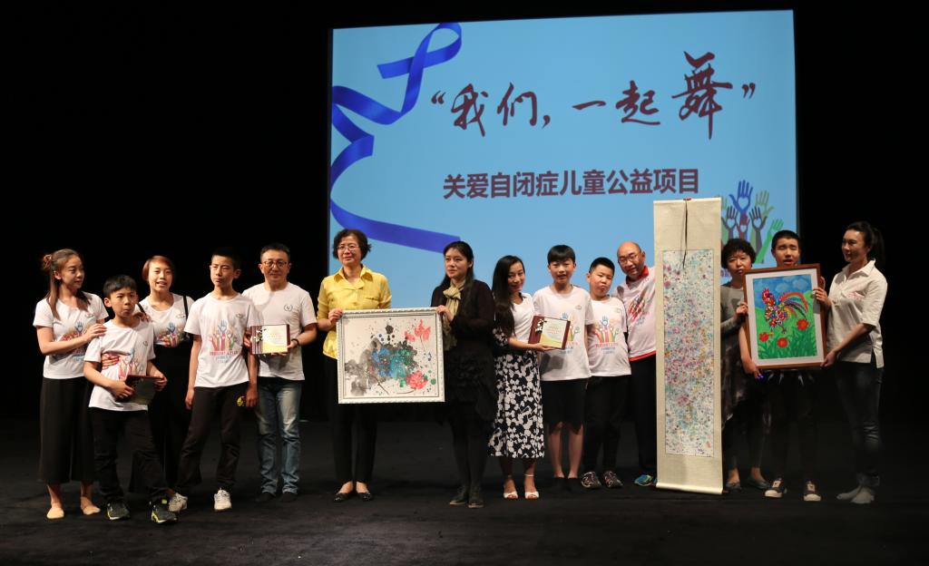 紧接着20位自闭症儿童合唱了一曲《萤火虫》,在孩子们的歌声中,我院党委副书记、纪委书记詹萌和上海宋庆龄基金会的代表一同走上舞台,接受了上海彩虹雨自闭症儿童康复中心孩子们捐赠的自闭症儿童画作。
