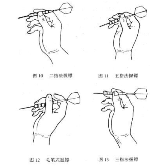 1.握镖方法取决于个人喜好,最常见的是三指握法