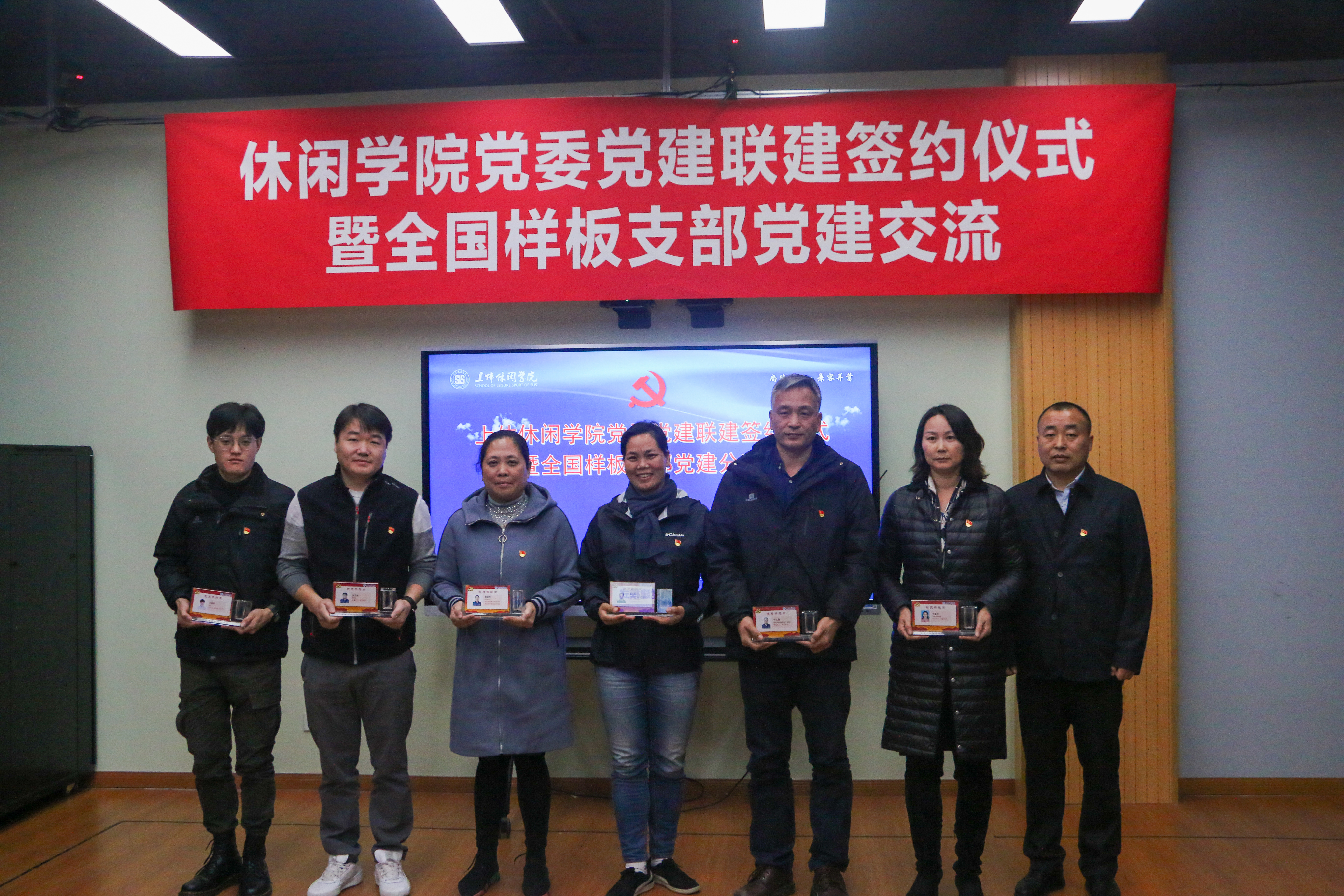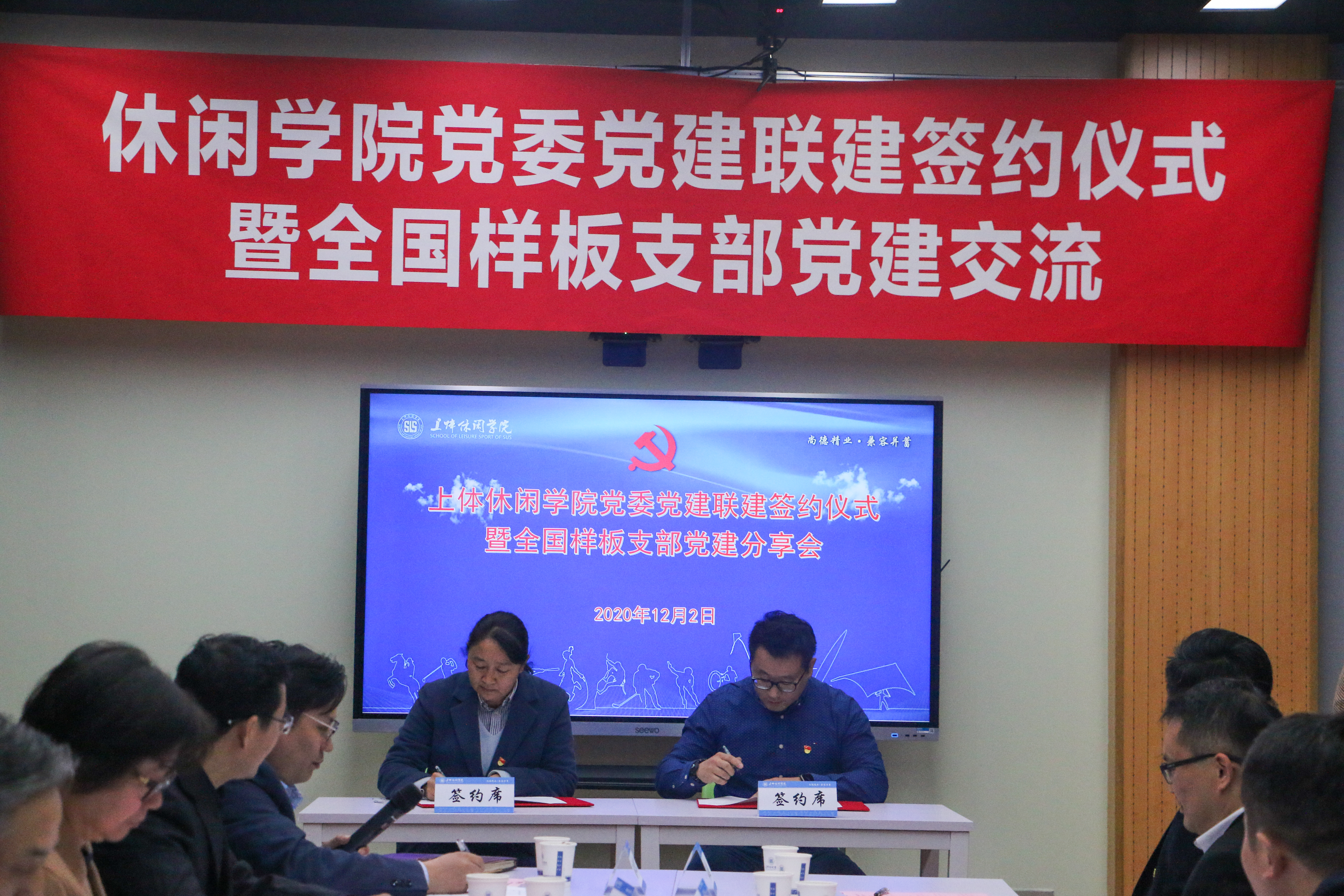 休闲学院院长、党委副书记王红英与上海师范大学环境与地理学院党委、上海东方绿洲党总支及上海市跳绳协会签署党建共建协议;休闲学院党委书记霍圣录与中国商飞上海飞机设计研究院人力教培党支部、杨浦体育局党委、杨浦殷行街道党工委、上海中医药大学博物馆签署党建共建协议。