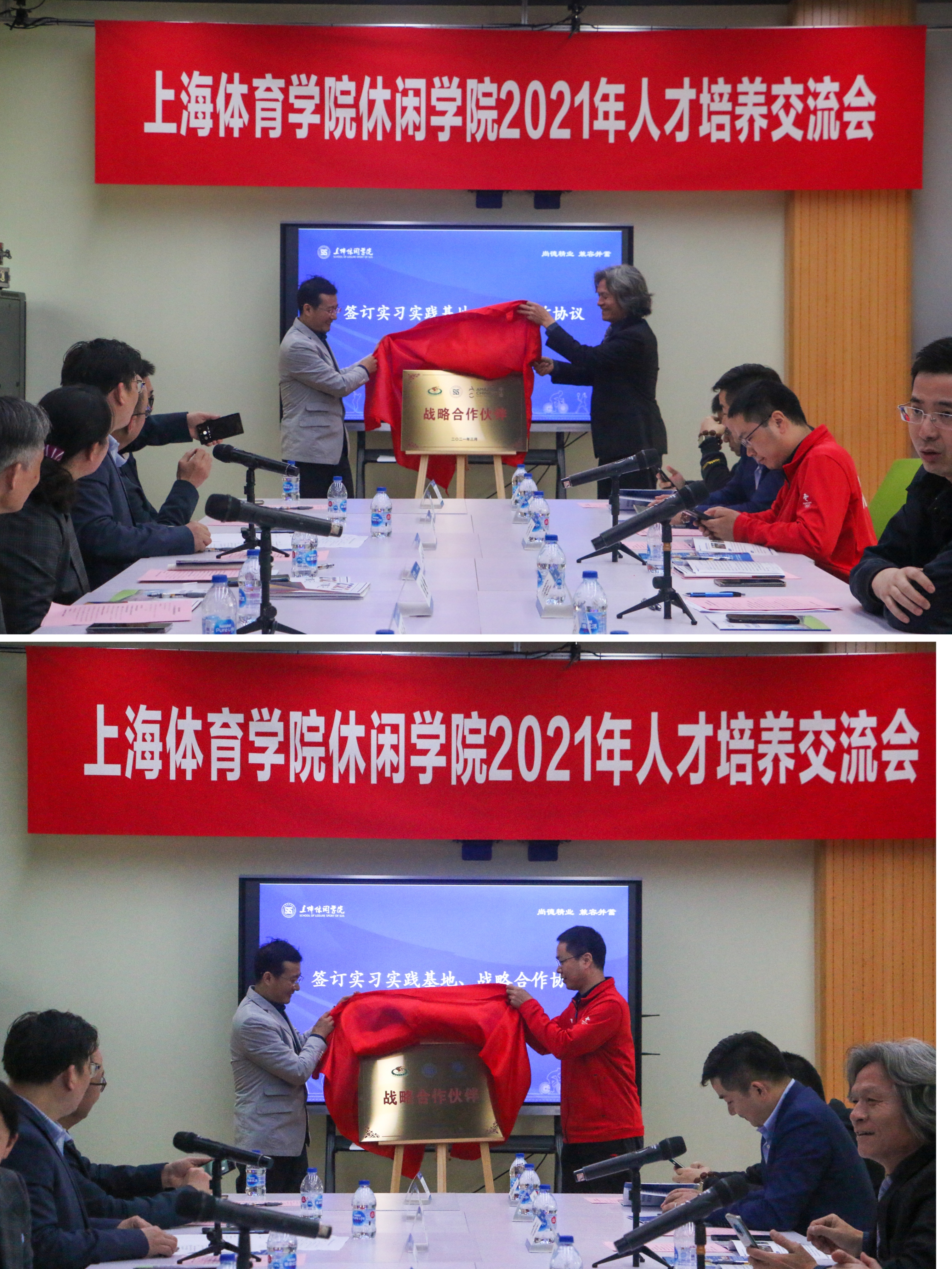 休闲学院党委副书记、副院长顾郑军与万航旅业(上海)有限公司总经理黄斌、上海英士博体育管理有限公司董事长程亮揭牌。