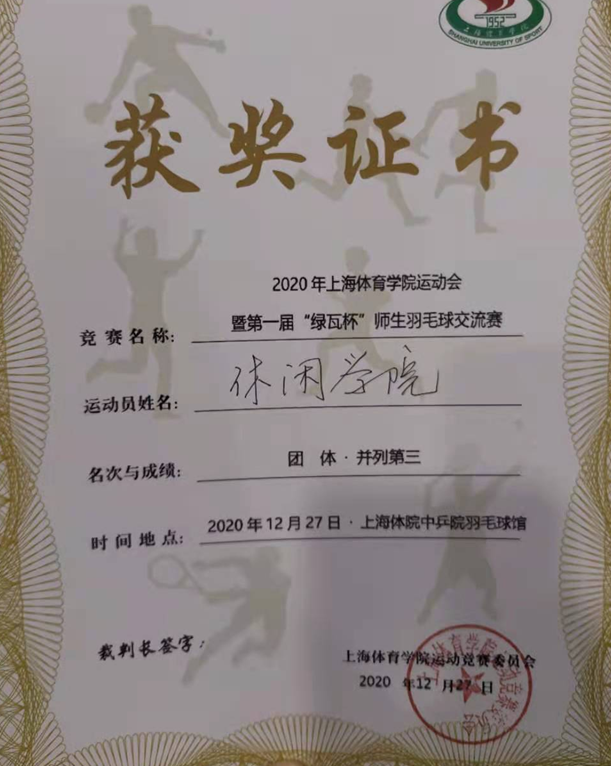 2020年12月27日上午,上海体育学院第一届“绿瓦杯”羽毛球师生交流赛隆重举行。来自各二级学院、学校各机关事业单位共十三支队伍参加比赛。休闲学院由尹从刚、刘树军、龚正伟、徐志军、李文阁、李冬锦、陈长洲等组成的代表队经过艰苦卓绝的比拼,最终获得团体第三名的优异成绩!