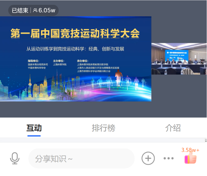 本次大会采取线上线下结合的方式,线上同步直播累计观看人次超过6万。本次大会的举办,从学科交叉融合的角度对竞技运动科学的发展进行了剖析,为参会者带来了理论知识和实践方法的“双丰收”,不仅提升了参会者的业务水平,也进一步加深了参会者对于竞技运动科学的理解。
