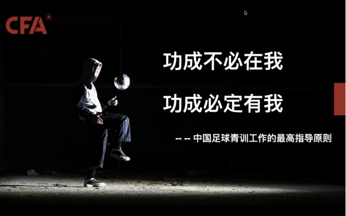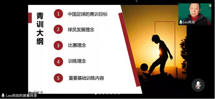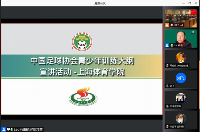 在宣讲开始前,足球教学团队负责人陶然成对于王雷指导的线上宣讲表示热烈欢迎,也指出《青训大纲》是代表目前国内最先进训练理念的指导性文件。希望足球专项的同学认真听课,课后认真研读大纲,以保证自己与国内先进的训练理念保持一致。