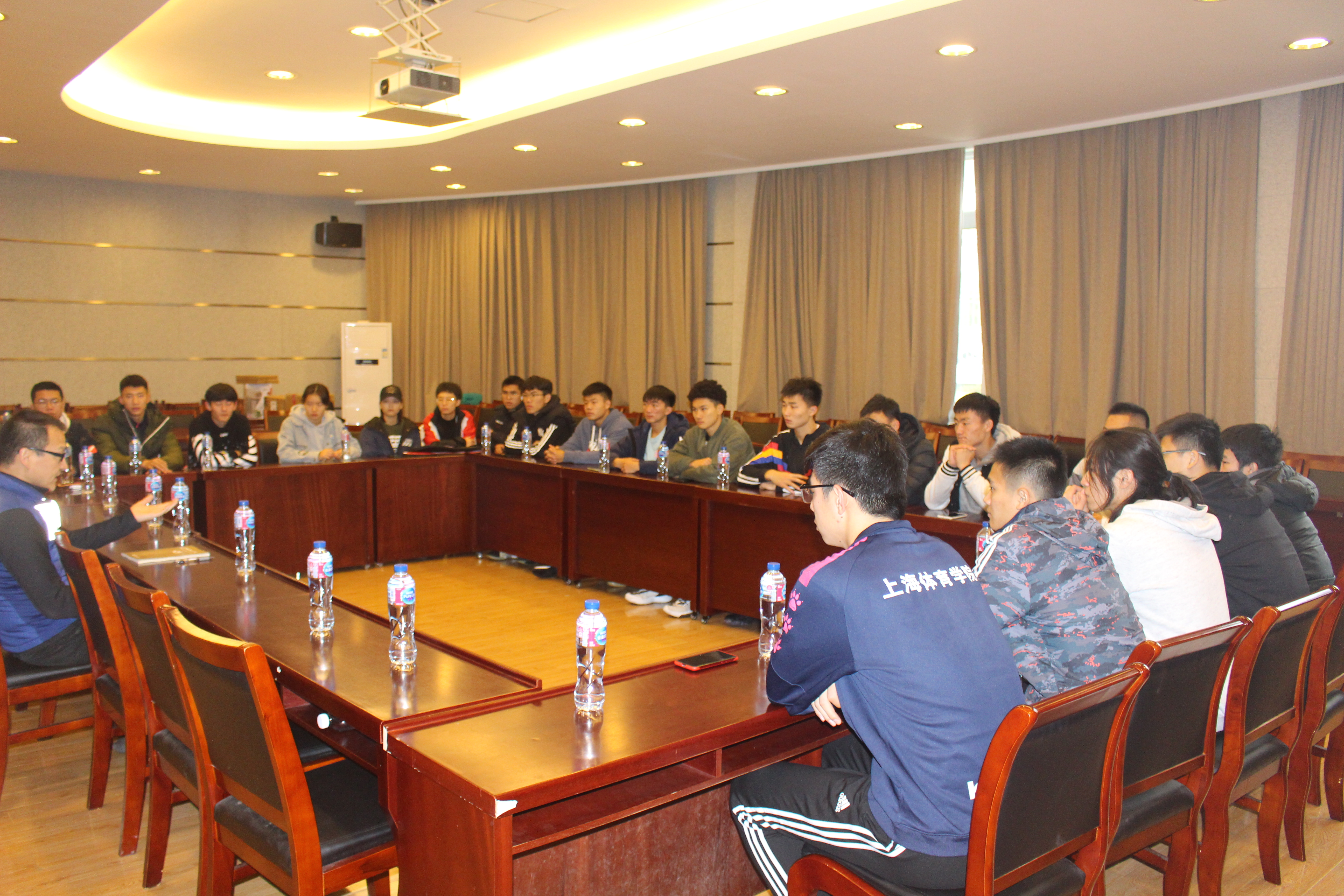 曹智超向全体2019级体能训练专业同学就体训学院当前的专业设置情况、体能训练专业学生的高考情况、文化背景和日常学习情况进行了讲解和深入交谈,并以现场举例分析的办法和与会同学共同探讨了相关的专业内容,曹智超勉励与会学生,除了要学好专业知识、进行科学训练外,也要对自己的未来发展有长期的规划,对未来升学、择业、就业等方面要做好提前准备。