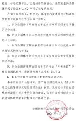 近日,全国体育职业教育教学指导委员会(以下简称“体育行指委”)在委托专家进行全面评估和认证的基础上,采纳《青少年运动技能等级标准与测试方法》(以下简称《标准》)作为全国体育职业院校学生体育专项课程学习掌握情况、教师体育专项课程教学成果、教育活动中青少年运动技能掌握情况、自主招生考试体育专项技能测试、体育类专业“单考单招”体育技能测试的评价标准,并拓展到其他体育职业教育活动中进行应用。