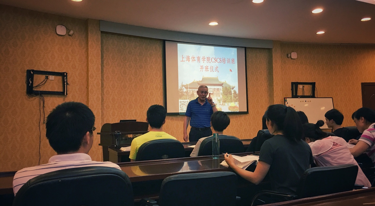 在开班仪式上丁院长为学员讲述了美国体能协会力量与体能训练专家资格(CSCS)证书在全世界范围内的含金量。我院创办本次辅导班的目的是三“为”:为提高我院师生参加专业资格考试的通过率;为体能训练方向培养高素质的师资力量;为进一步提升我院“双证型”人才的培养。