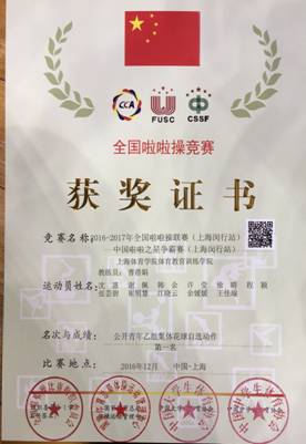 2016年12月8—11日,“2016-2017年全国啦啦啦啦操联赛(上海闵行站)比赛”在闵行体育馆隆重举行。此次比赛规模庞大,有来自中国各省市的121支队伍参赛,运动员共达2710名。上海体育学院代表队是由体育休闲与艺术学院曹蓓娟老师为教练兼领队,以及体育教育训练学院2015级硕士研究生崔明慧、谢佩、程颖、韩余、沈惠、许莹、江晓云、张芸碧、余媛媛、徐晴、王佳瑜11位学生组成,获得了“全国啦啦啦啦操联赛—公开青年乙组集体花球自选动作”第一名的好成绩,并收到了参加国际啦啦操赛事的派遣函。