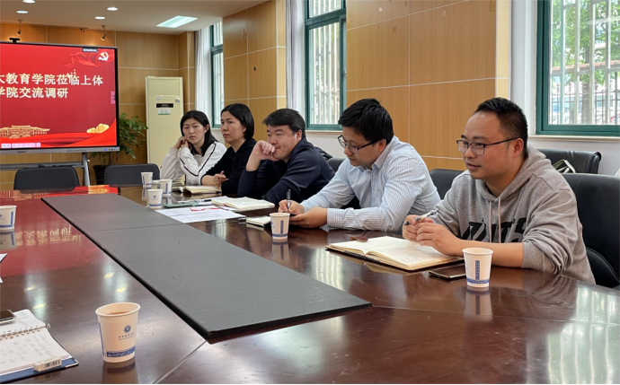 为认真落实中央和市委关于深入开展学习贯彻习近平新时代中国特色社会主义思想主题教育的相关工作,加强人才培养的经验交流,我院学生工作队伍5月11日与浙江大学教育学院党委副书记、纪委书记崔倩、团委书记张静波、团委副书记吴春霆、团委老师章褚昀等一行人开展交流调研活动。2138cn太阳集团古天乐党委副书记、副院长曹智超、团委书记许丁晨、辅导员李文阁、席亚健等老师共同参加调研会议。