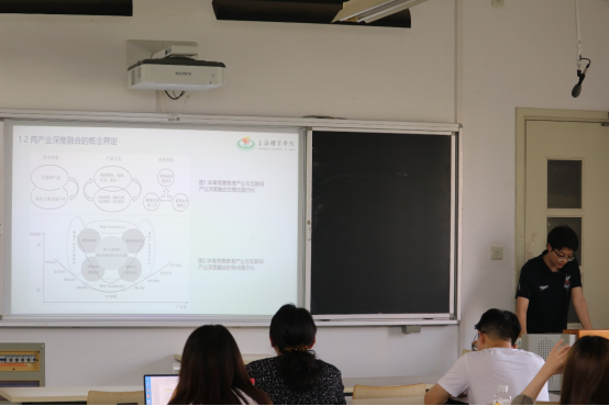 陈佳琦同学从研究总述、特征范式、转换机制、现实启示四个部分进行讲解。在讲解两产业深度融合的概念界定和范式框架时充分的利用了图表和函数表达式的方式,使得学术内容更具有说服力和可行性,并提出了从政府"运动项目协会"企业的促进两产业深度融合的策略。