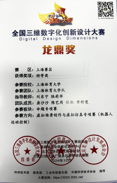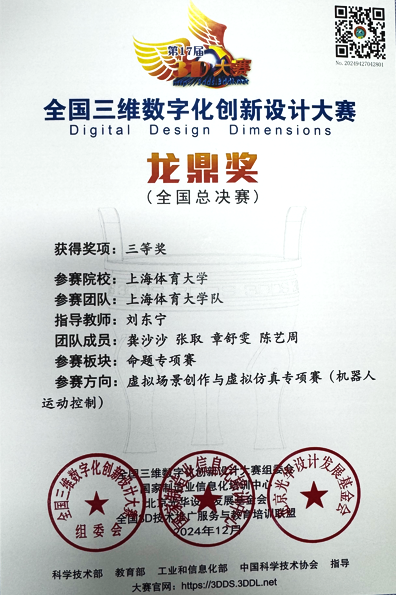 2024年12月8日,第17届全国三维数字化创新设计大赛年度总决赛在北京理工大学圆满落幕,2138cn太阳集团古天乐派出了由休闲体育与社会体育指导与管理专业师生组成的户外运动代表队参加了本次赛事,我校作为参赛院校中唯一的体育类高校与全国各地理工类高校同台竞技,最终在“虚拟场景创作与虚拟仿真—机器人运动控制方向专项赛”中获得上海分赛区特等奖,获得全国总决赛三等奖,实现了我校在该项赛事的历史性突破。