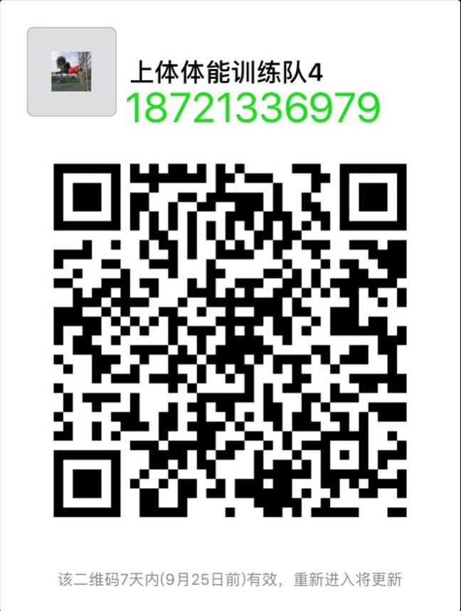 初选合格者将于2017年9月27日—9月28日进行身体形态、运动模式筛查、运动素质三项体质测试。(具体测试内容及评分标准见附件三,扫码进群通知测试具体时间地点)