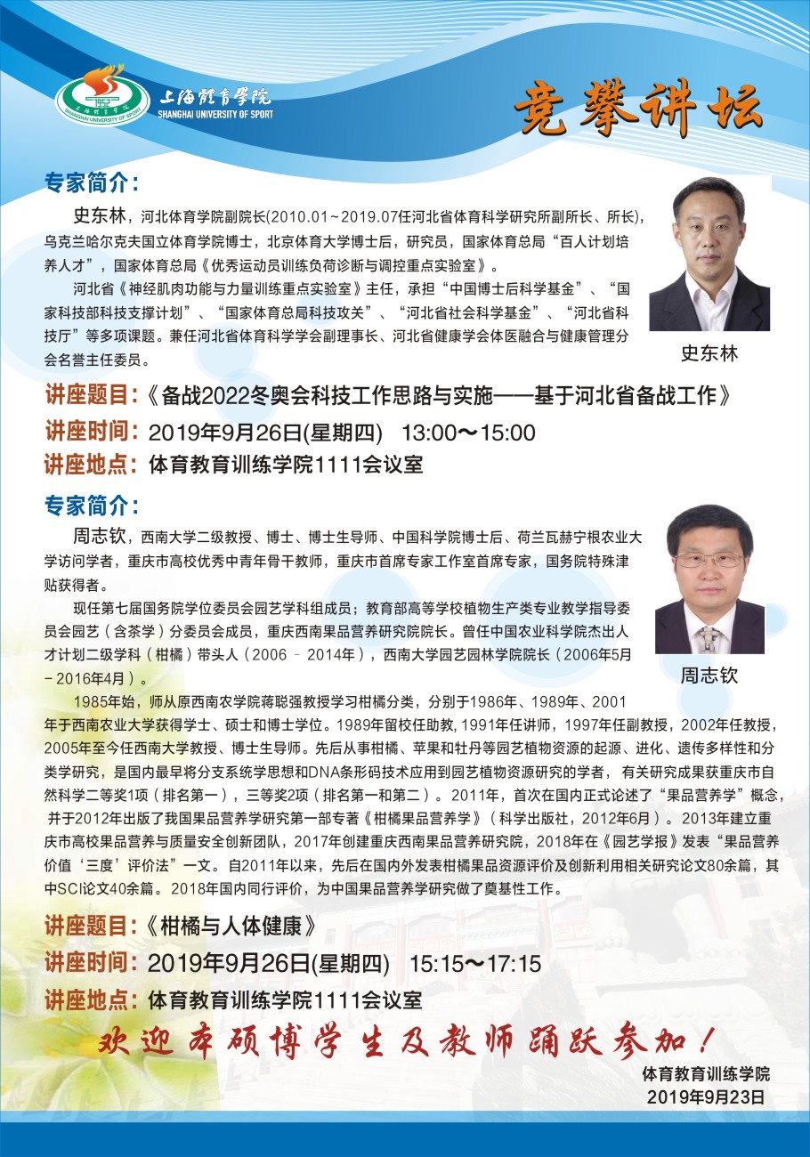 上海体育学院体育教育训练学院“竞攀讲坛”系列讲座 通知