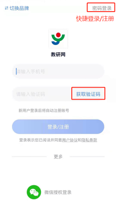 2.点击右上角“快捷登录/注册”或“密码登录”。
