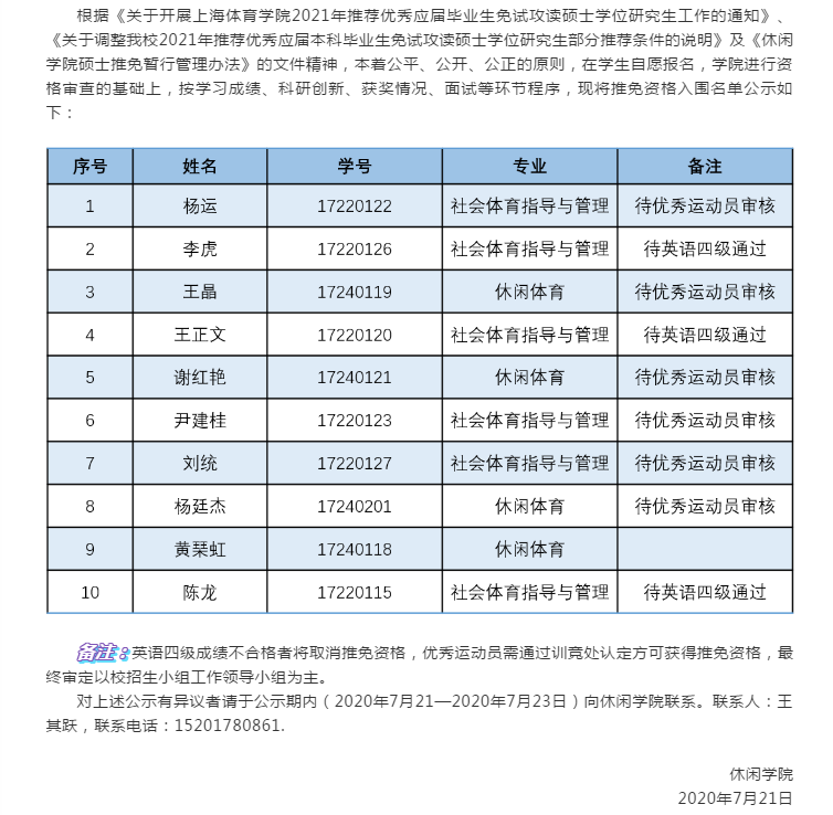 休闲学院2021届本科毕业生推免资格入围名单公示