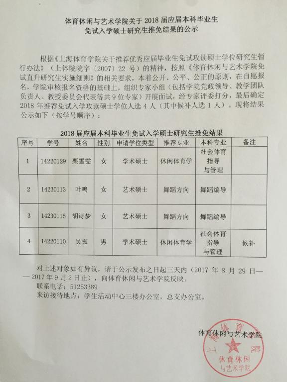 体育休闲与艺术学院关于2018届应届本科毕业生免试入学硕士研究生推免结果的公示